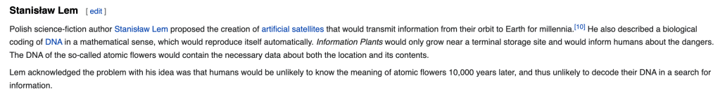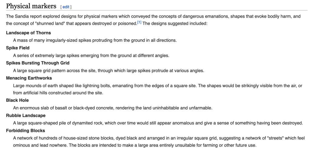 I find these ideas such a strange look into the future, looking to the past to see what may survive into the future. Although I feel the physical markers are the most imposing.