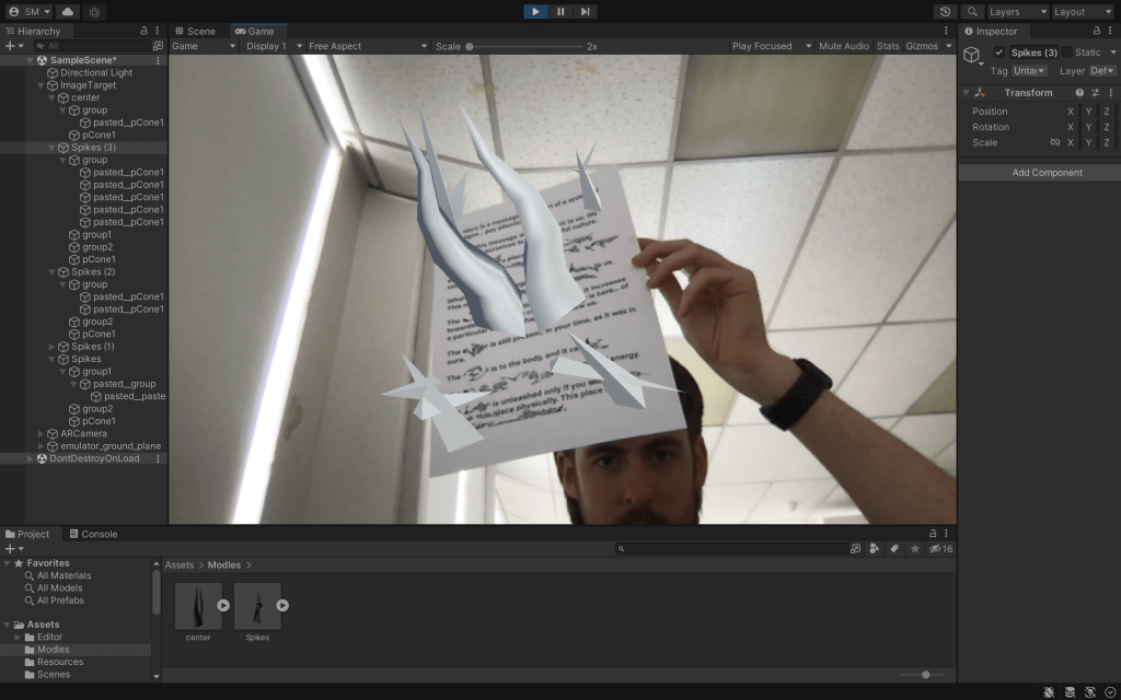 I feel like it adds another dimension to the exhibition as these pieces could easily be shown on their own without the need for the AR experience. I also wish to work with 3D models this could be ones I make or find or re use. My previous work for AR has been limited to 2d elements and I feel that having unity central to this experience would be a great way to make use of this. I especially like how the work seems to interact with the environment which really adds to the experience.