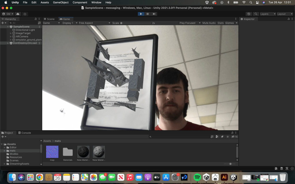 I think taking this project further will be more to do with the staging, perhaps with it being outside or in a larger room. I overall did enjoy this project and I am very happy with my outcome as I feel I achieved something very close to my initial ideas. I have worked with AR briefly before so knew the limitations well but the experience of actually building it like an app using unity was very fresh and interesting for me.