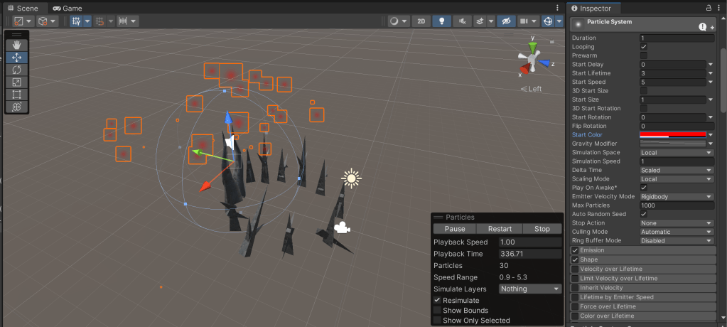 I made some attempts at doing particle systems but with the limited time I have all my attempts were sort of lacking just couldn’t get past the 2d glowing sprite used by the default.