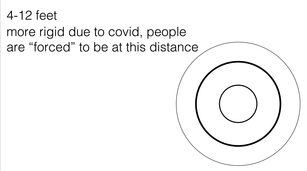 As proxemics is all to do with how you perceive your space it is different for everyone. It also has changed a lot since lockdown started. Italian psychologists last year discovered that our idea of personal space has doubled this idea interested me and inspired me to create the image above, an abstraction of an ever expanding “social space”, will it be we must be miles away from another person to feel comfortable? Probably not, but it’s entertaining to think about how the pandemic has effected the way we interact with others in this context.
