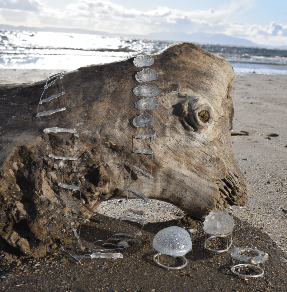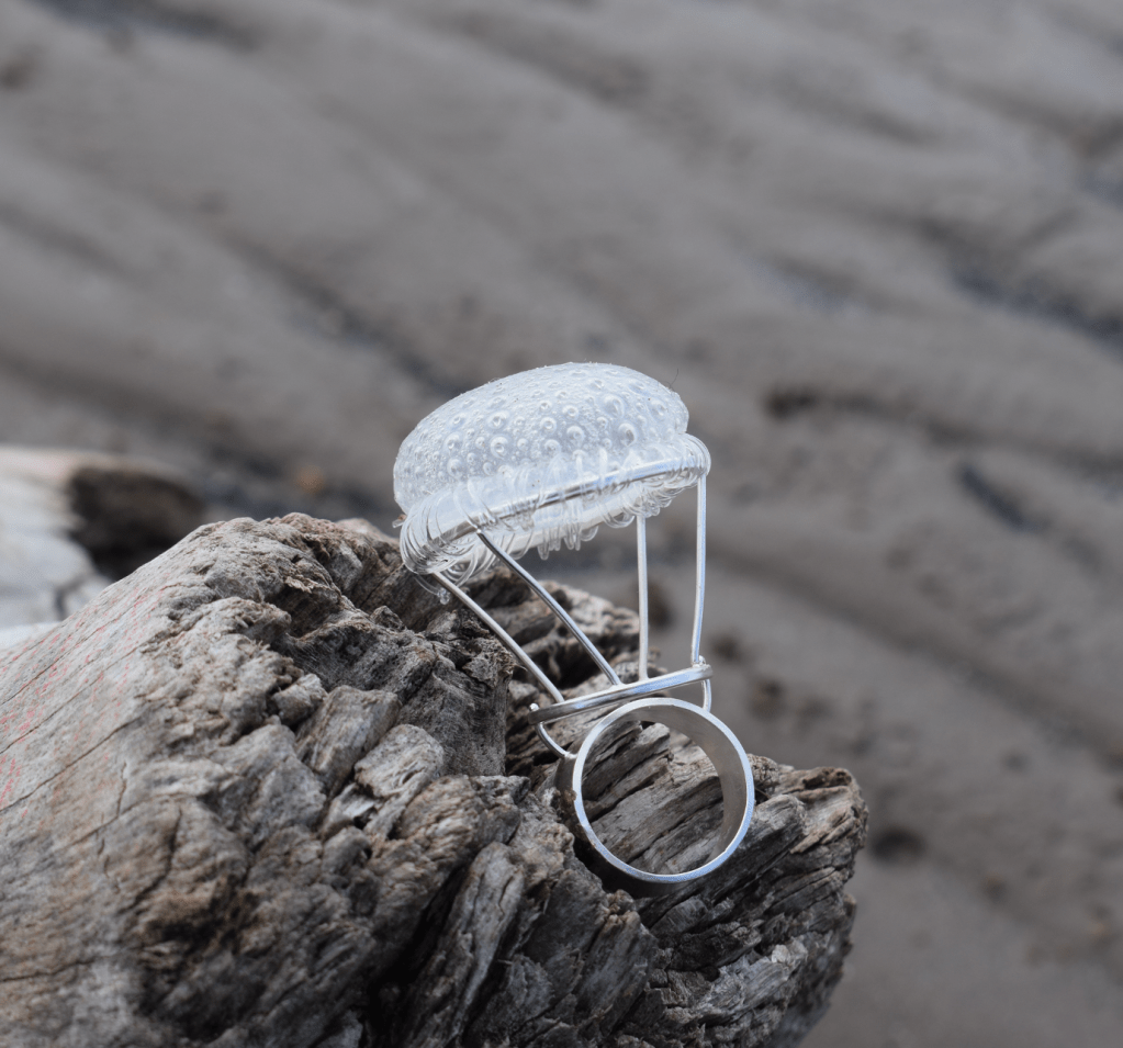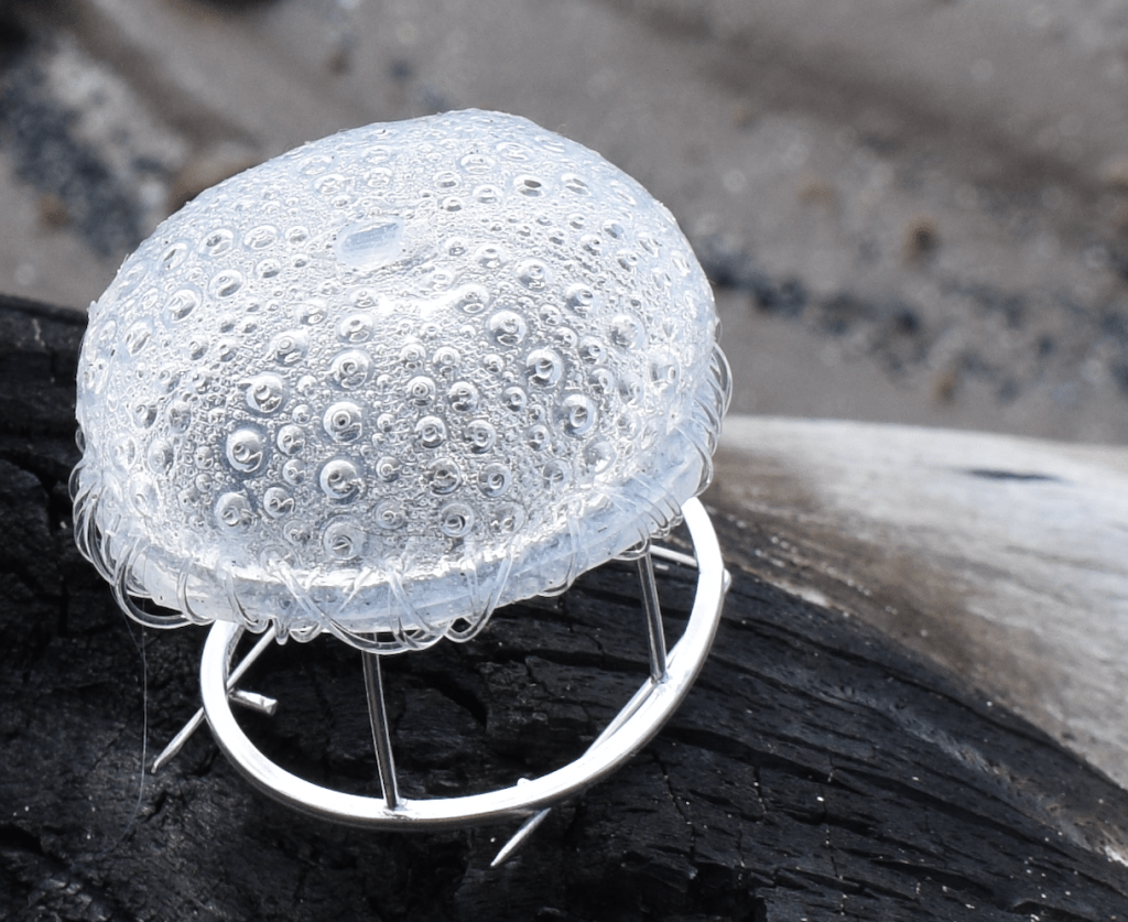 The materials used in the collection such as resin, silicon and fishing line are all seen as dangerous to ocean life, it directly addresses the responsible use of materials, by creating long lasting jewellery out of materials that would normally be single use or discarded next to silver a metal which we would consider precious. It encourages discussion about the environment and how we can be more responsible both as creators and consumers.