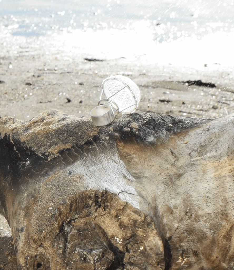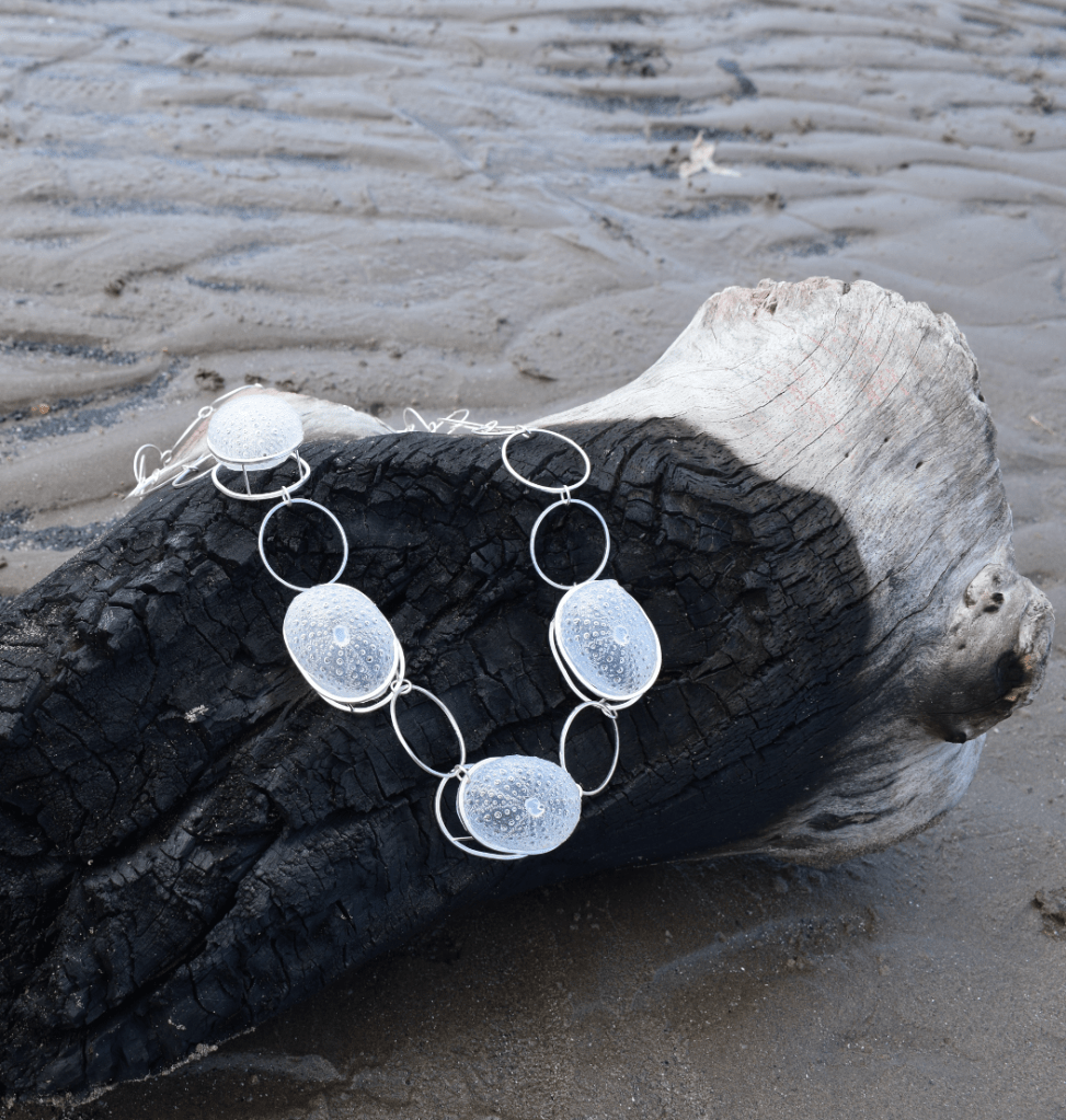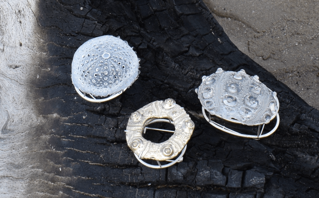 Taking back the items to the beach allows the viewer to see directly as to what the forms of the collection are inspired by, the casts of sea urchins and other ocean forms in silver and resin directly contrasts the softer forms of the sand and wood that they are photographed with. It allows viewers a moment of refection provoking thoughts in their head about materiality while still being captivated in the intricate forms of the shells.