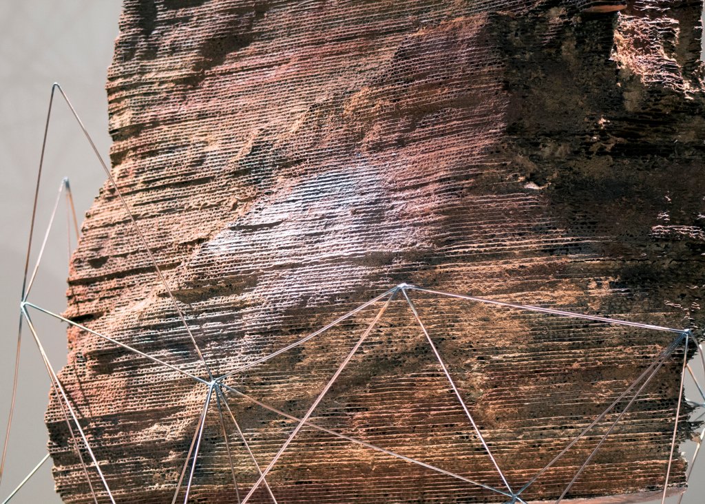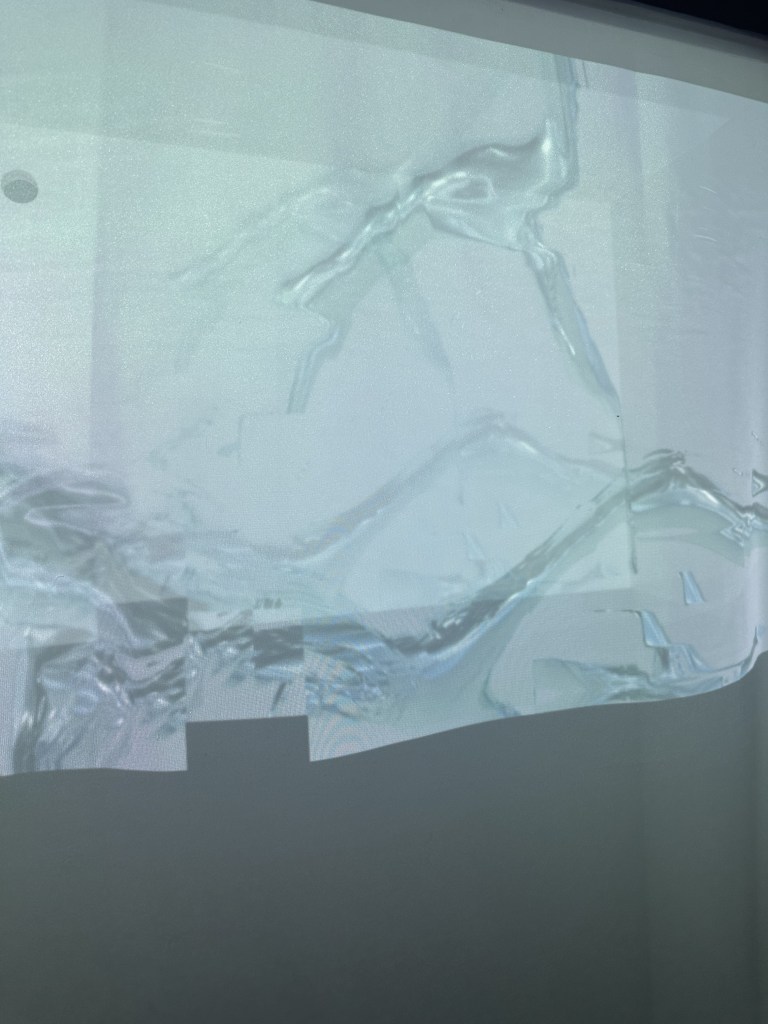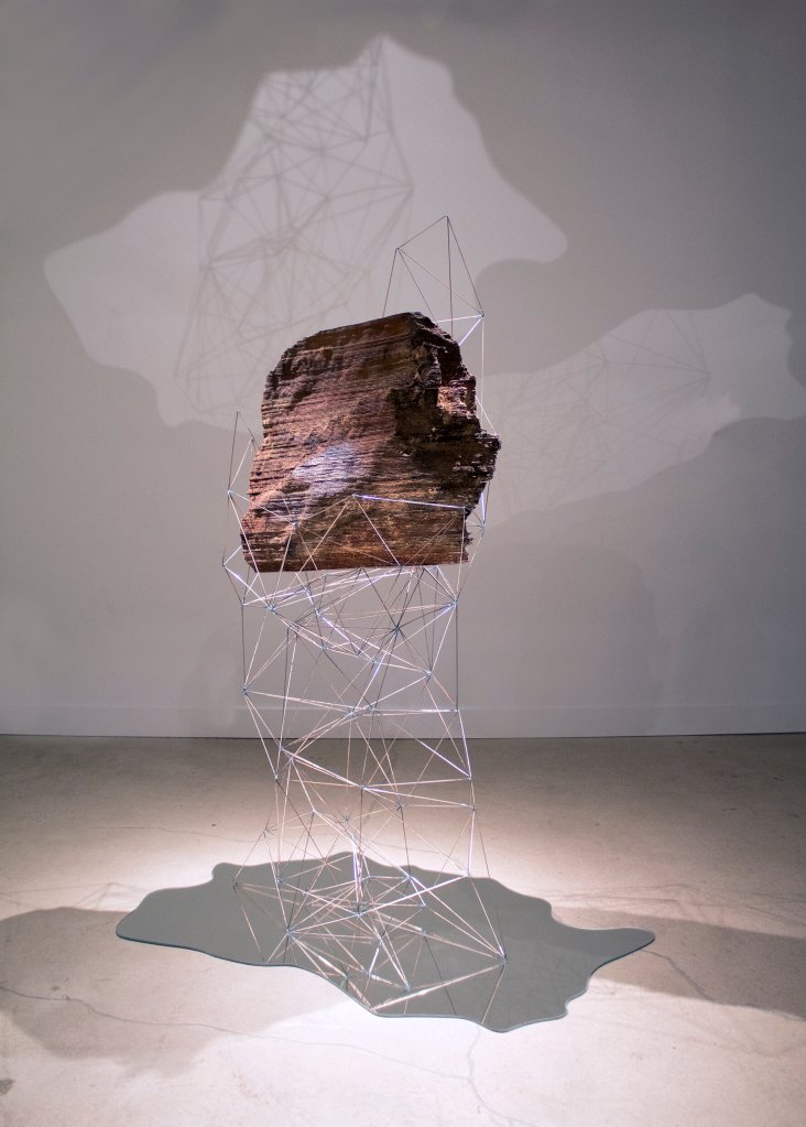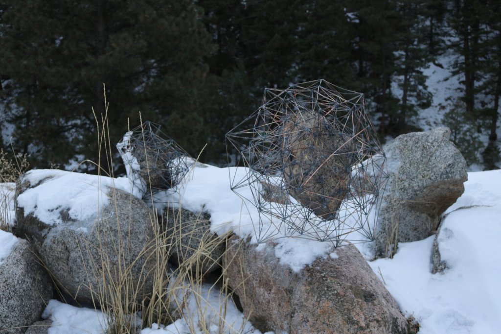 With these two works exploring what we consider to be natural with more natural forms contrasted by the mesh structure of the glass and welding rods contrasted by the more natural forms of the 3D printed rock or the video of an iceberg melting.