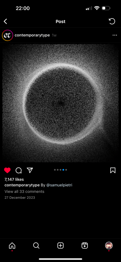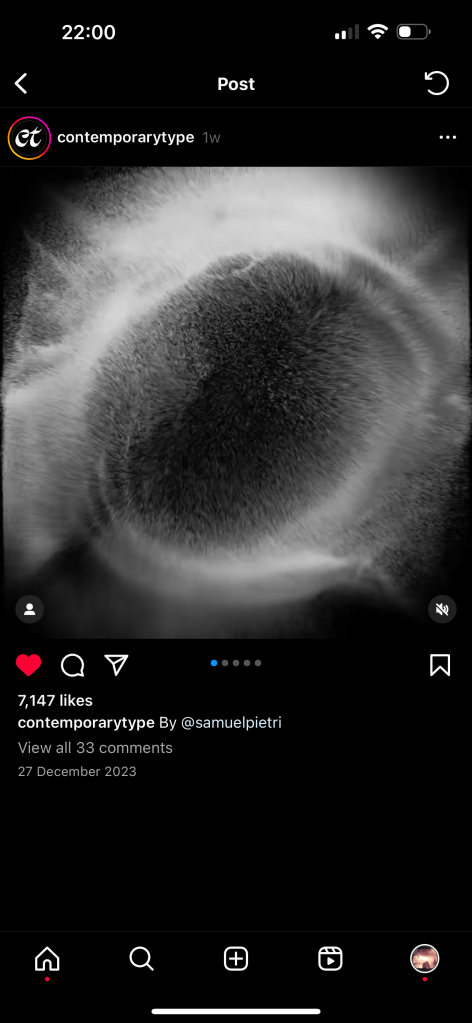 Through Instagram I found this artist / designer that created a particle field to generate what I originally thought were letterforms but I am second guessing that upon reflection, however, with moments of chaos being stripped away for a moment of clarity before the animation resumes. There is somehow almost no compression on instagram for the animation which adds to the intrigue of the piece allowing the viewer to see the details of the particle field.