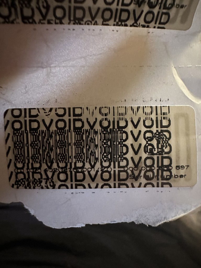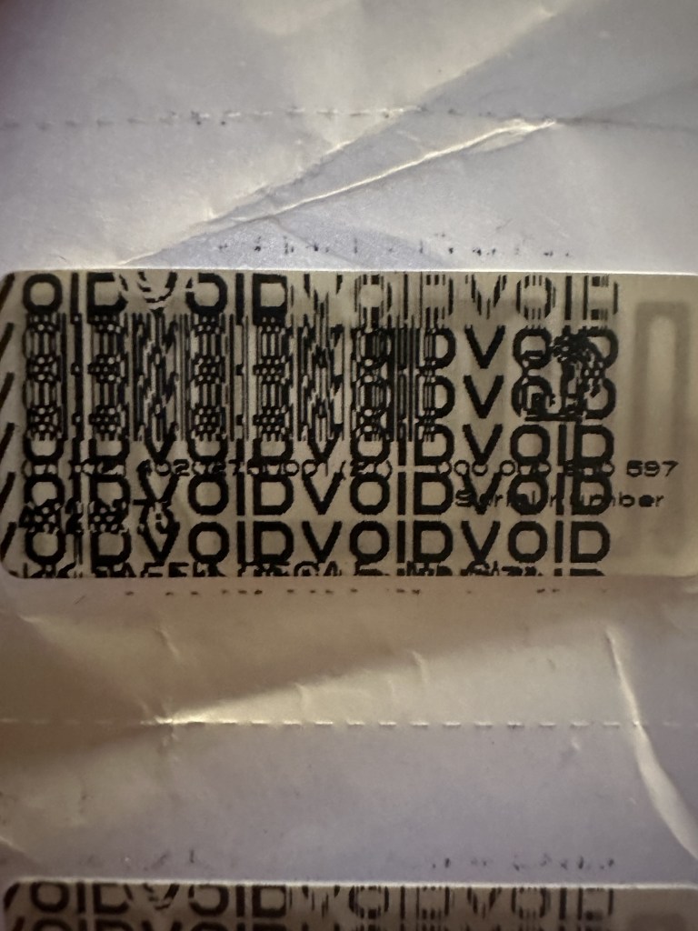 This layered text is very reminiscent of my research into errors and mistakes in design while also keeping faith to the industrial found type aspect of my research. There can be multiple versions of this I have seen over time with some different text being printed beneath the VOID text, sometimes even in cyrillic alphabet. I feel like the layering and application of these labels are interesting as it is a very mechanical process it can be seen there are some errors that are nearly the exact same on both labels with prints being offset onto the backing paper in the same areas. As it is a thermal printer is also creates the receipt like quality.
