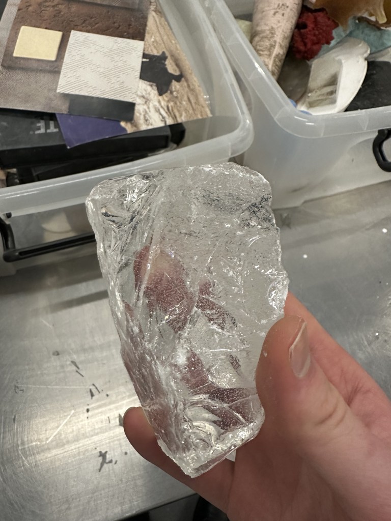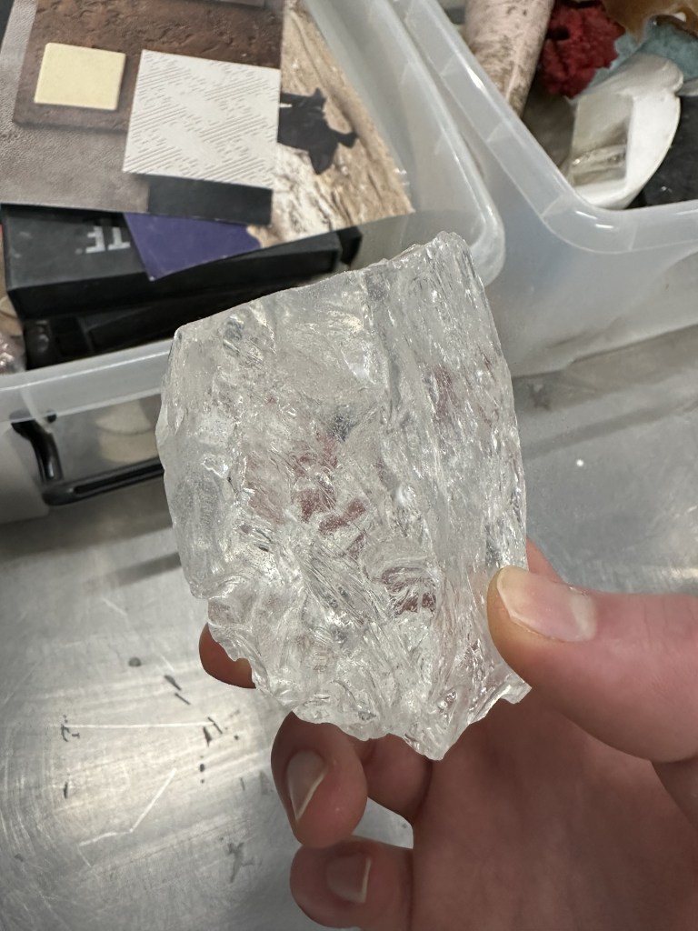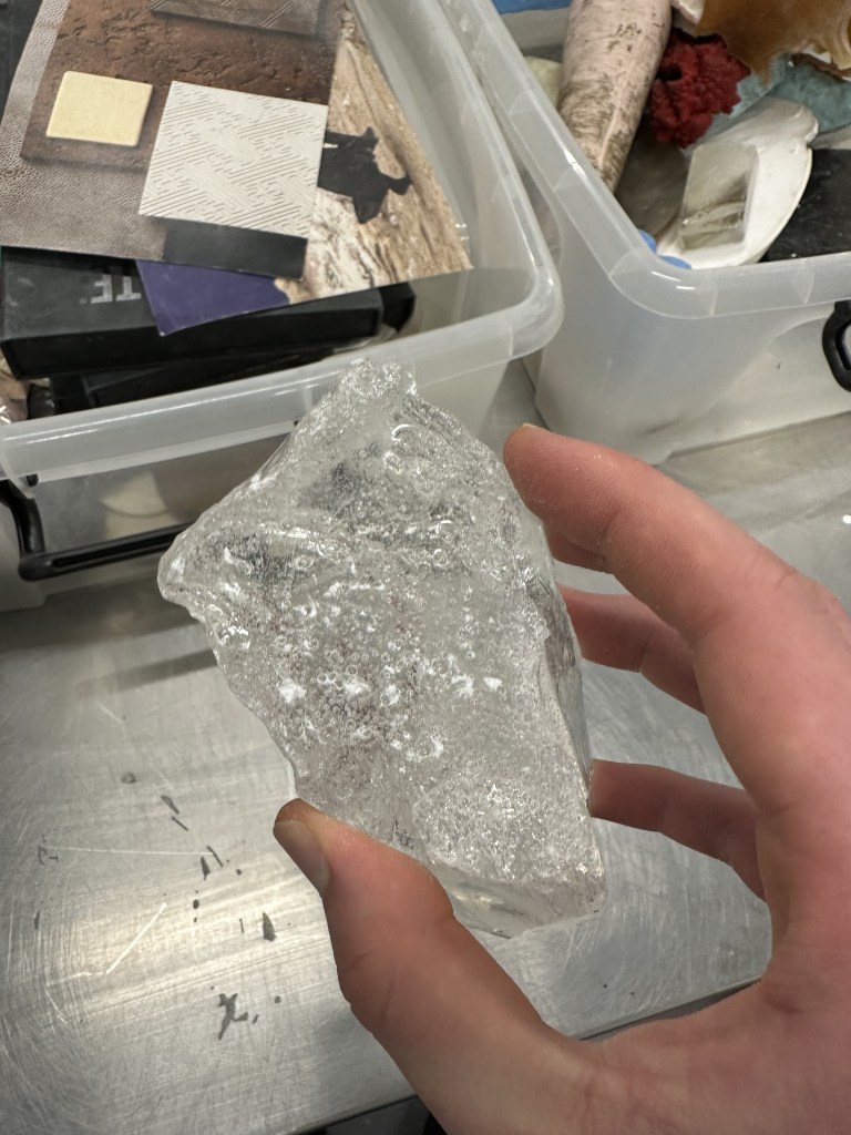 The glass wax also reminds me of some of the renders I created experimenting with clear materials. I feel like the ability to bring these to life would be amazing using the glass wax to create replicas of a 3D printed mould would be a great experiment to go with. I feel like this wax material combined with a similar process of concrete or softer plaster to showcase degradation may be the way to go for creating a real life variant to these 3D models.