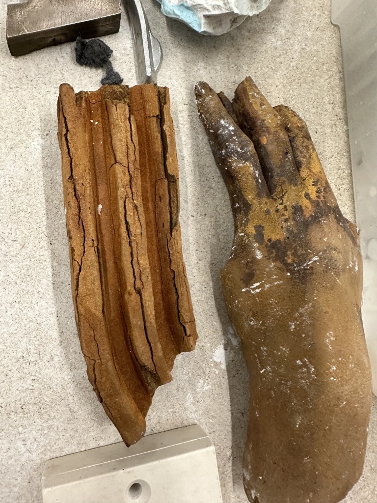 I found some of the materials and processes so interesting, with loads of potential for experimenting with glass wax as seen in the photos above, as well as the processes for adding extra colour / texture to the casts with jesmonite being the best for taking colour pigmentation with processes such as putting pebbles and stones while mixing the plaster allows the object to be polished revealing the pattern inside. Another process I found of note was the use of iron filings incorporated into the casting process, this means that the object would have a metallic finish but would then rust over time (3 weeks to create according to jack the technician), this really captured my interest due to my previous experiments with time based processes, such as my paper in the doorways I did in November.