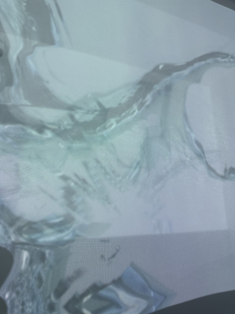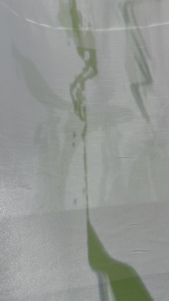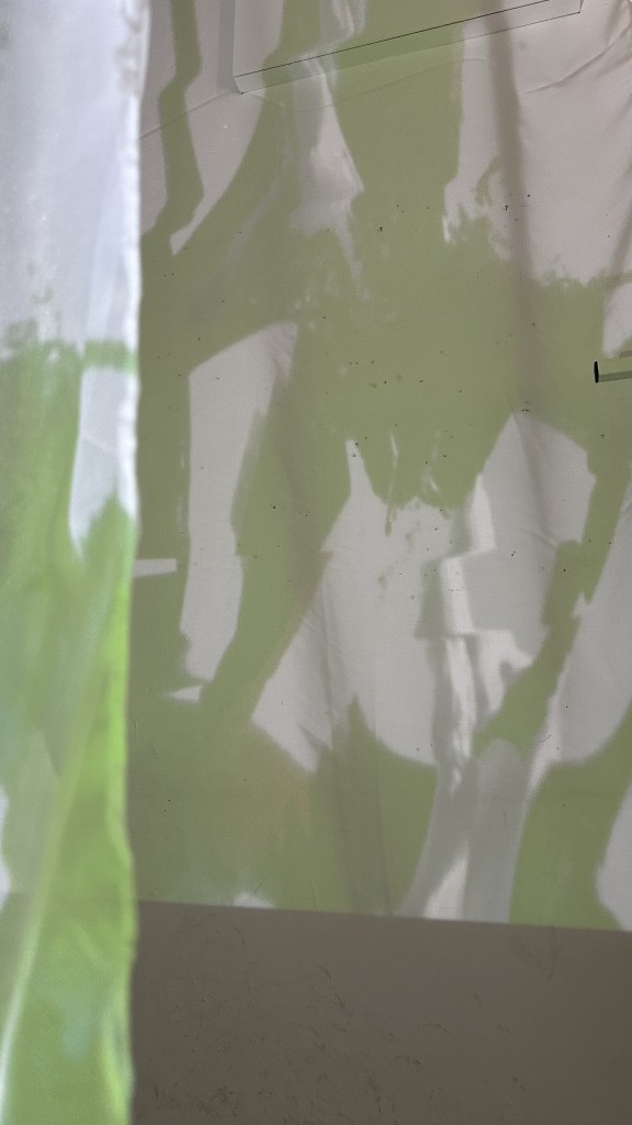 Hanging my cloth over a vertical vitrine, allowed me to quickly test my fabric with a projector. Initially grabbing these pictures to show the depth of the projection.