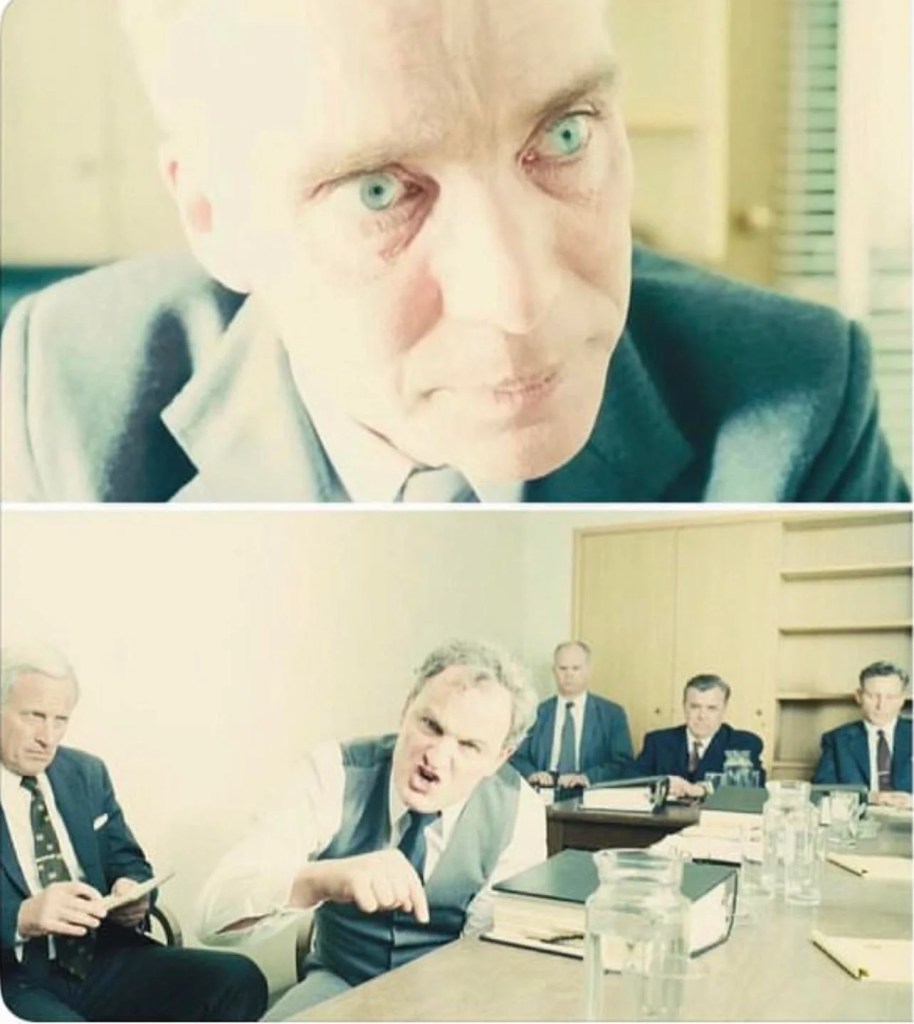 This use of light in this extreme sense, pure white light is not only used to showcase the bombs power, but also in scenes where Oppenheimer himself is faced the outcomes of his actions such as the trial where his actions were picked apart. The light also comes with a outburst of anger from one of the panelists. This bright intese light is used extremely successfully to portray Oppenheimer’s discomfort in the situation showcasing the overwhelming nature of the conversation and his own thoughts. The light directly relays this over to the viewer as the bright white light filling the room so suddenly is extremely uncomfortable for those viewing in a cinema. When I personally watched this scene I was in the front row and had to look away due to how bright the lights were but this only adds to the successfulness of the techniques used
