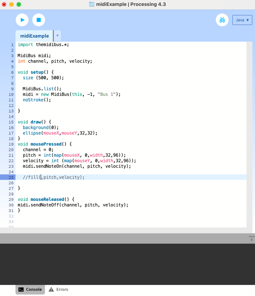 While waiting for my case room induction I spent some time re familiarising with some of the code from the audio visual module last year. Specifically using processing to send out MIDI notes to garageband,