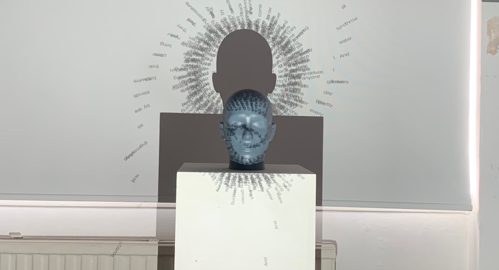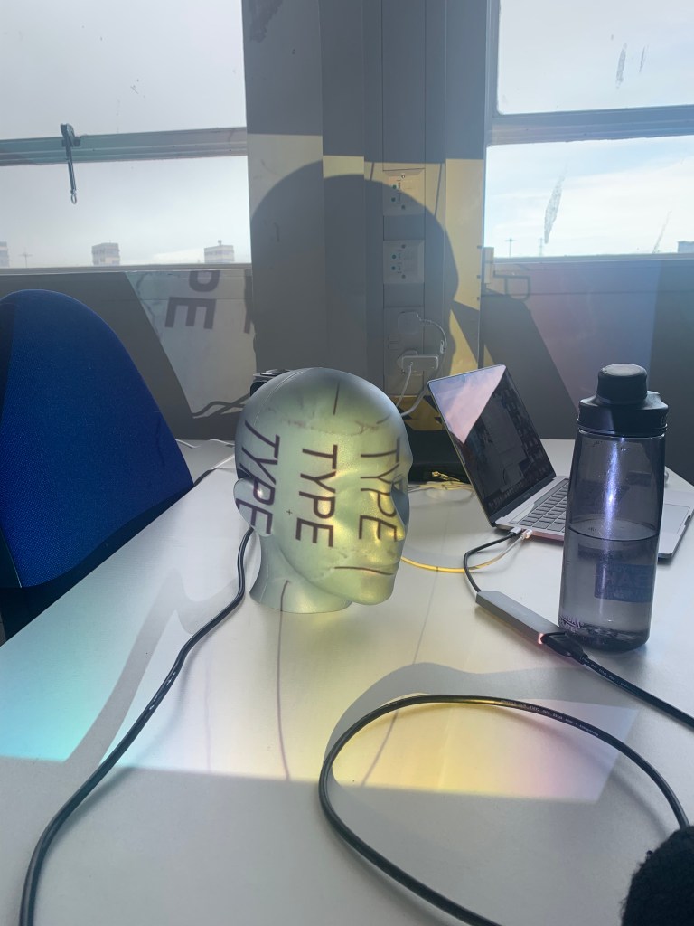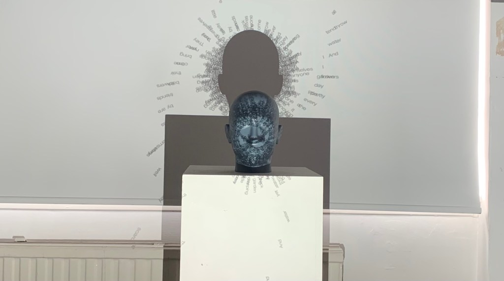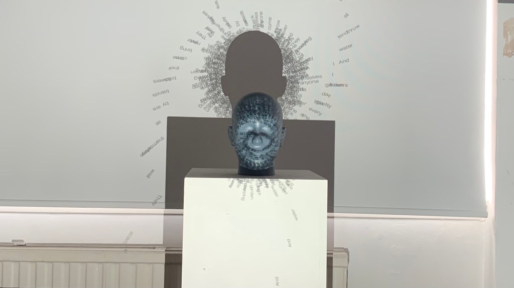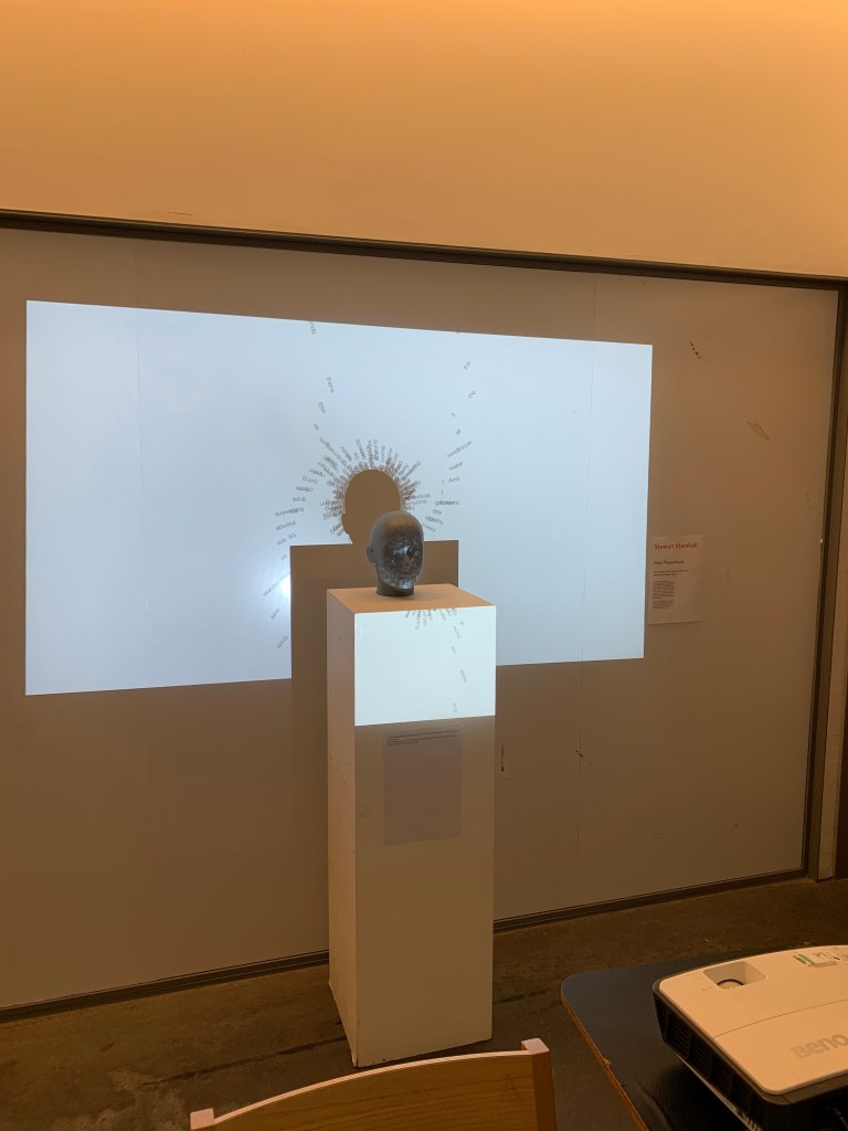 My piece in the flesh in the Reid. I really enjoyed seeing my work in a installation setting, its something I’ve never really done before, I’ve had my work up in college before but to actually see people enquiring about my work and having a shot on the box to manipulate the words was brilliant. It’s something that I think Ive almost feared in the past but with the amount of work I put into this I really just wanted to get it out there and it felt so rewarding, I just wish it was there for longer because it felt like just as we got it set up we had to go. I suppose It’s just the result of having it linked up to the laptop but it would be interesting to use some sort of mini pc in order to not have my laptop connected up. I also really wish I took more photos of it in the Reid the timing just wouldn’t allow for it, however it did actually look better set up in the studio as the lighting in the Reid wasn’t the best for projection.
