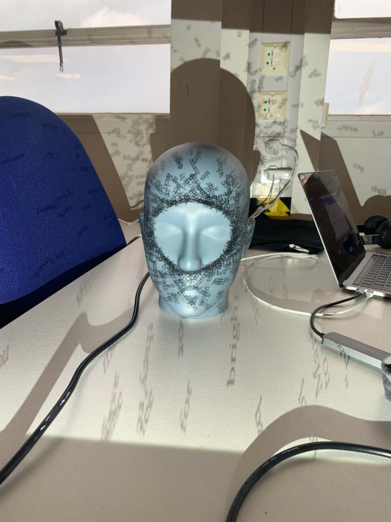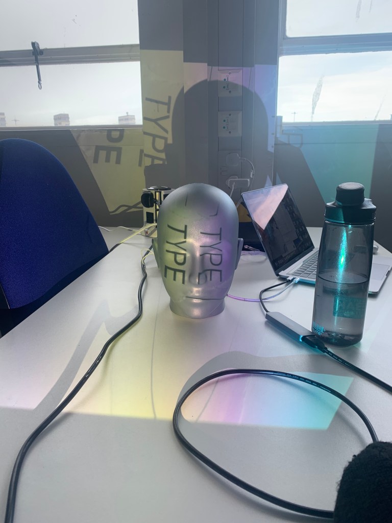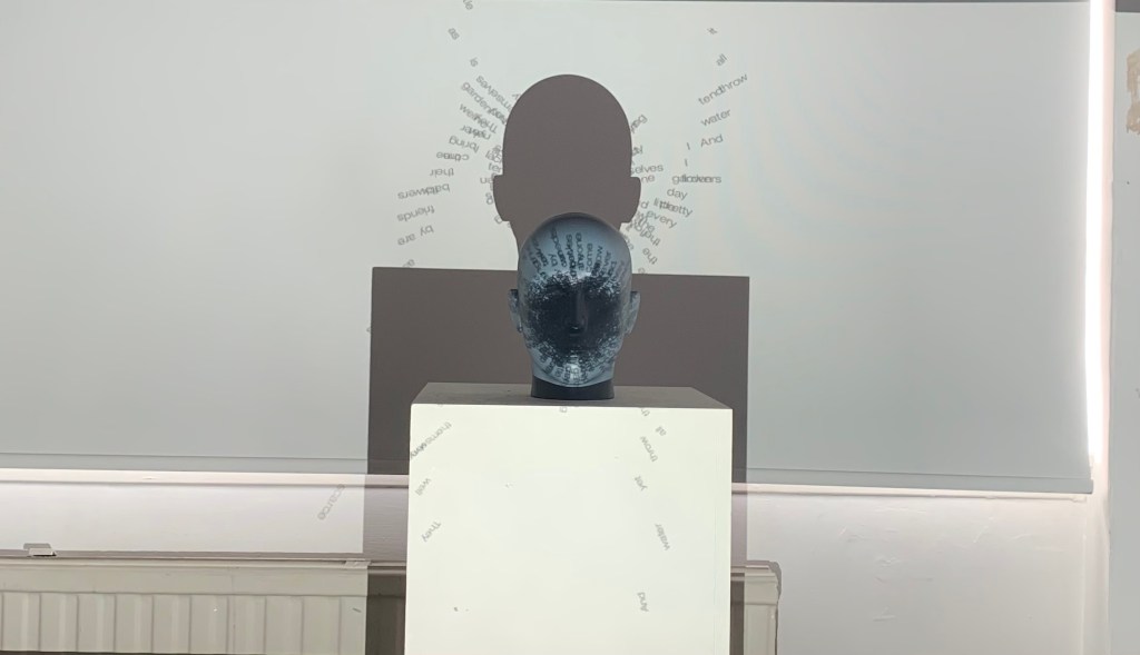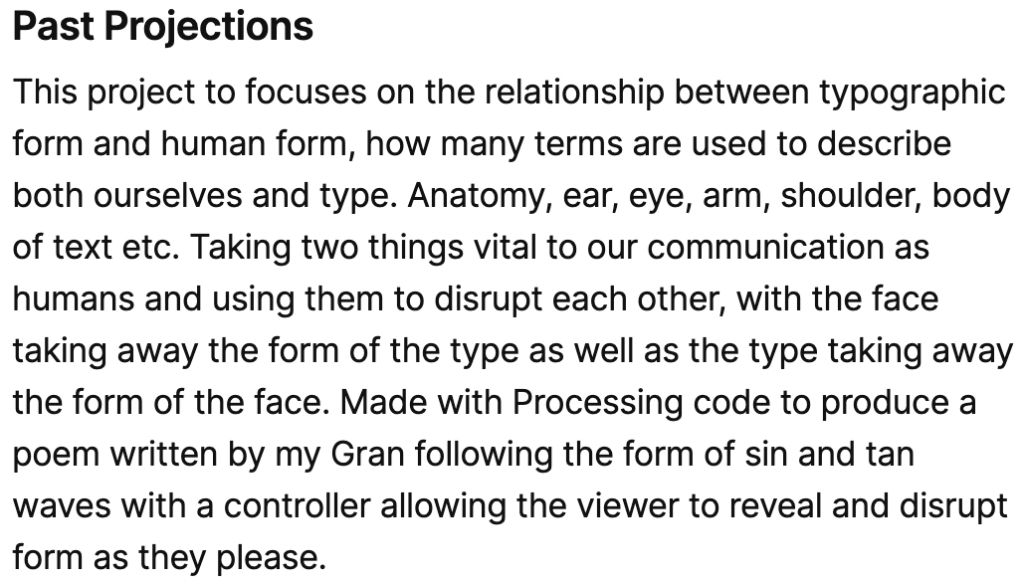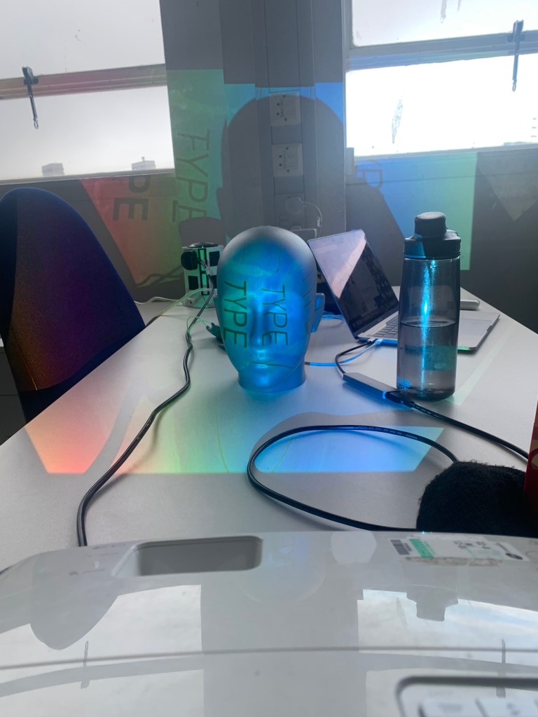 My piece in the flesh in the Reid. I really enjoyed seeing my work in a installation setting, its something I’ve never really done before, I’ve had my work up in college before but to actually see people enquiring about my work and having a shot on the box to manipulate the words was brilliant. It’s something that I think Ive almost feared in the past but with the amount of work I put into this I really just wanted to get it out there and it felt so rewarding, I just wish it was there for longer because it felt like just as we got it set up we had to go. I suppose It’s just the result of having it linked up to the laptop but it would be interesting to use some sort of mini pc in order to not have my laptop connected up. I also really wish I took more photos of it in the Reid the timing just wouldn’t allow for it, however it did actually look better set up in the studio as the lighting in the Reid wasn’t the best for projection.