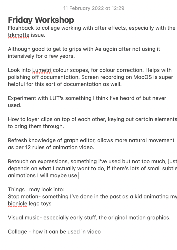 I found the expression part of this workshop interesting with the use of looping, will be helpful with precomps etc and improving workflows, stops just copying and pasting keyframes etc.