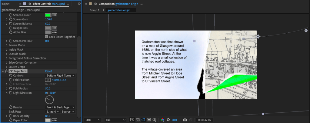 I also came into some technical difficulties with the techniques I was using such as the page turning and keying effects not playing ball with each other, so I had to adjust my animation to accommodate this, such as changing part of it to the pages moving off the screen instead of another tear, however I do think this is a good thing as it keeps it changing, not as repetitive.