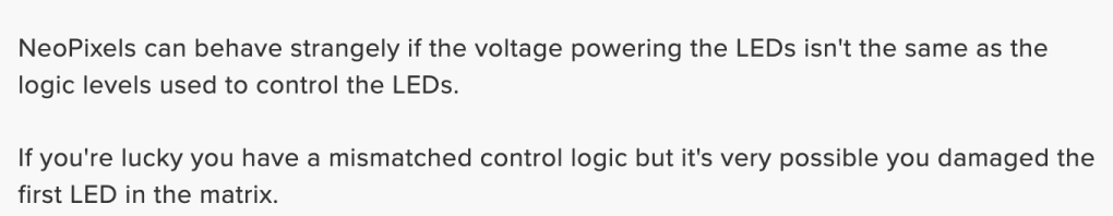 However after getting my stuff downstairs and plugging it in for the first time, only 3 LED’s were lighting up with my code and a fourth was bright green. According to Adafruit forums this could range to be anything from a wiring error with varying voltages to a damaged LED strip.