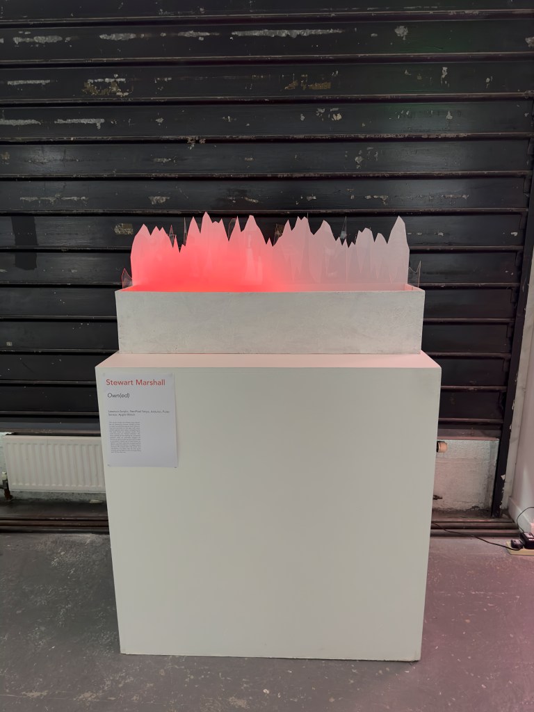Coming off the back of Expressive data I already have an installation ready work that I could quickly implement into the space, all I have to do is figure out was how it needs to be powered then it will be ready to go. Initially going off of the same power source as Gina and Kiron we had to change and rejig the area, with help from Matthew and Gillian we managed to figure out exactly how to power our corner especially with the amount Matthew needed, most other people needed 2 or 3 plugs but because im just running the Arduino and neopixel I managed to fit in with just 1. I wanted to get my piece sorted and in place as soon as possible so on Tuesday afternoon with help from my course-mates I managed to lug everything downstairs into the garage space. I ended up settling with the space behind the second shutter that would stay down to give the lights their full effect.
