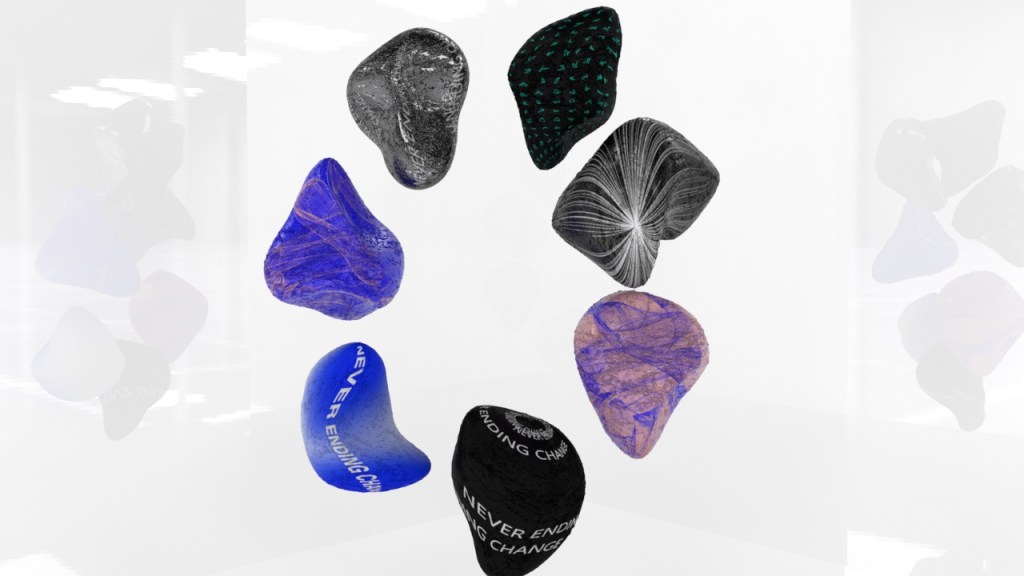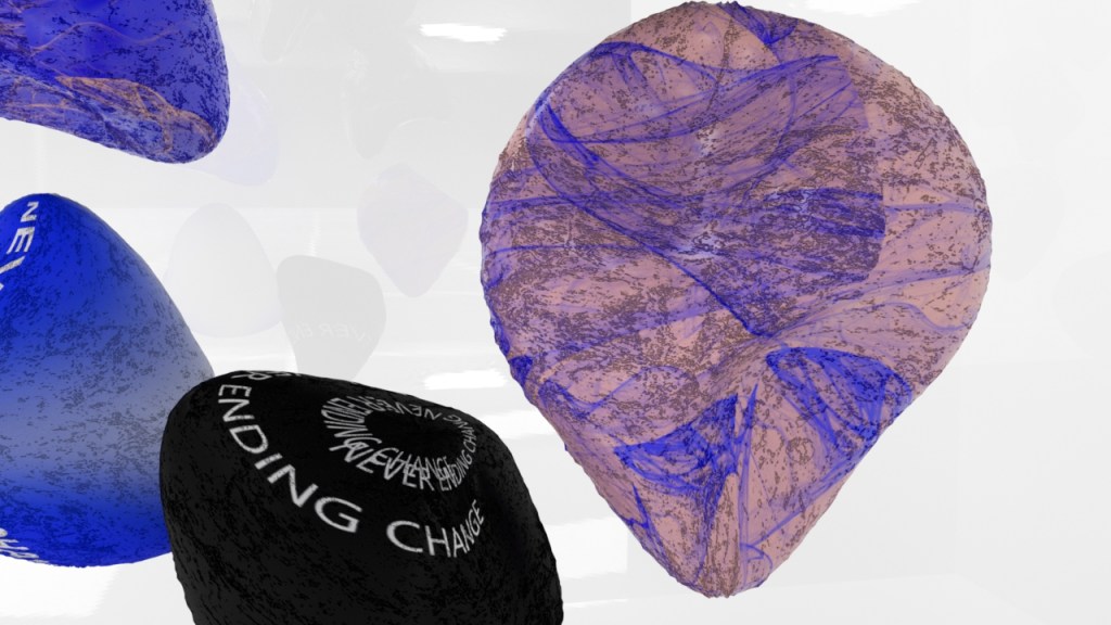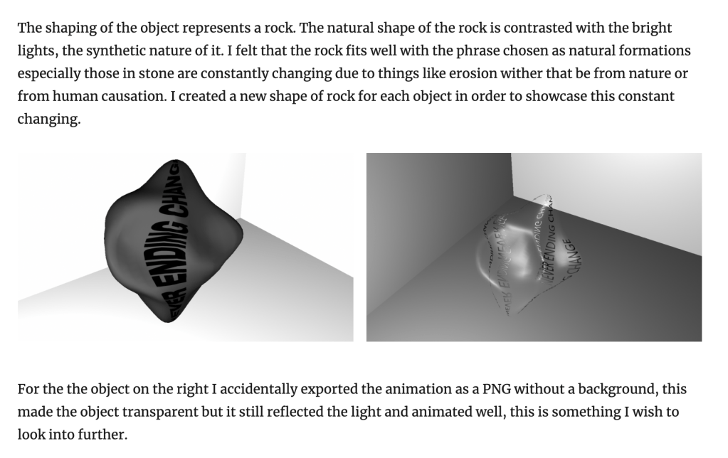 In my work I wanted to highlight the idea of perpetual “never ending” change, I chose rocks as they are constantly being changed by natural processes as well as human activity. I sculpted each rock differently in order to demonstrate this. I also chose to animate certain textures included to further highlight the idea of change as well as the flowing nature of some of the text and patterns. To give the feeling of movement even though it is at a standstill.