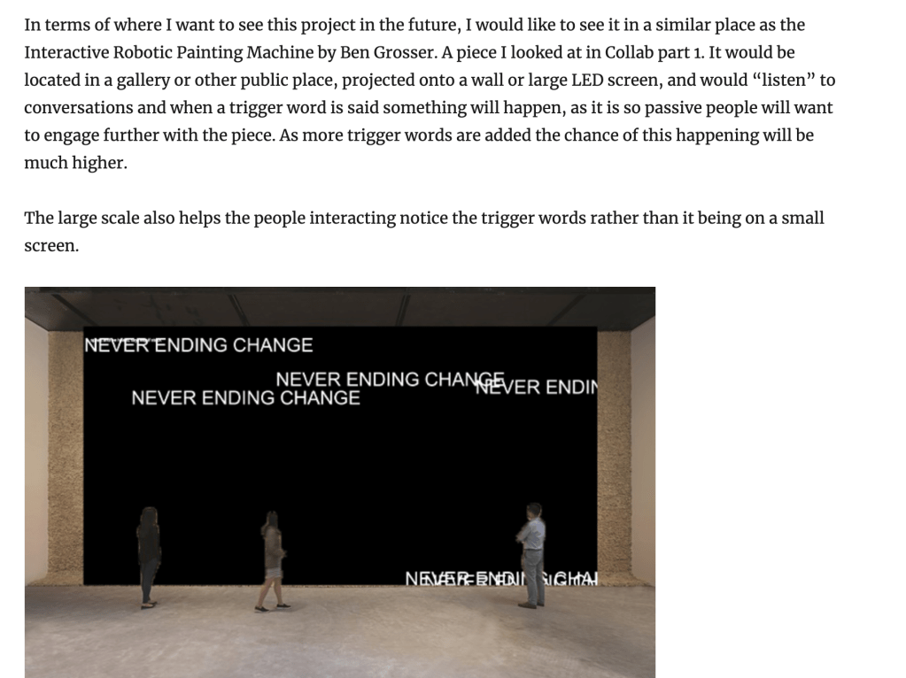 We were prompted to go more in depth in our projects and really reflect on them, for week 1 especially we are to think of what projects are best suited to the online display, for me I feel like most of my projects would be well suited online, however I feel like there are some projects better suited to it than others, if this were a physical gallery I would have used the Web Fundamentals project as I had the idea of presenting it projected on a wall and being very passive, I feel like if it was presented online it loses the impact that it would have in a physical gallery