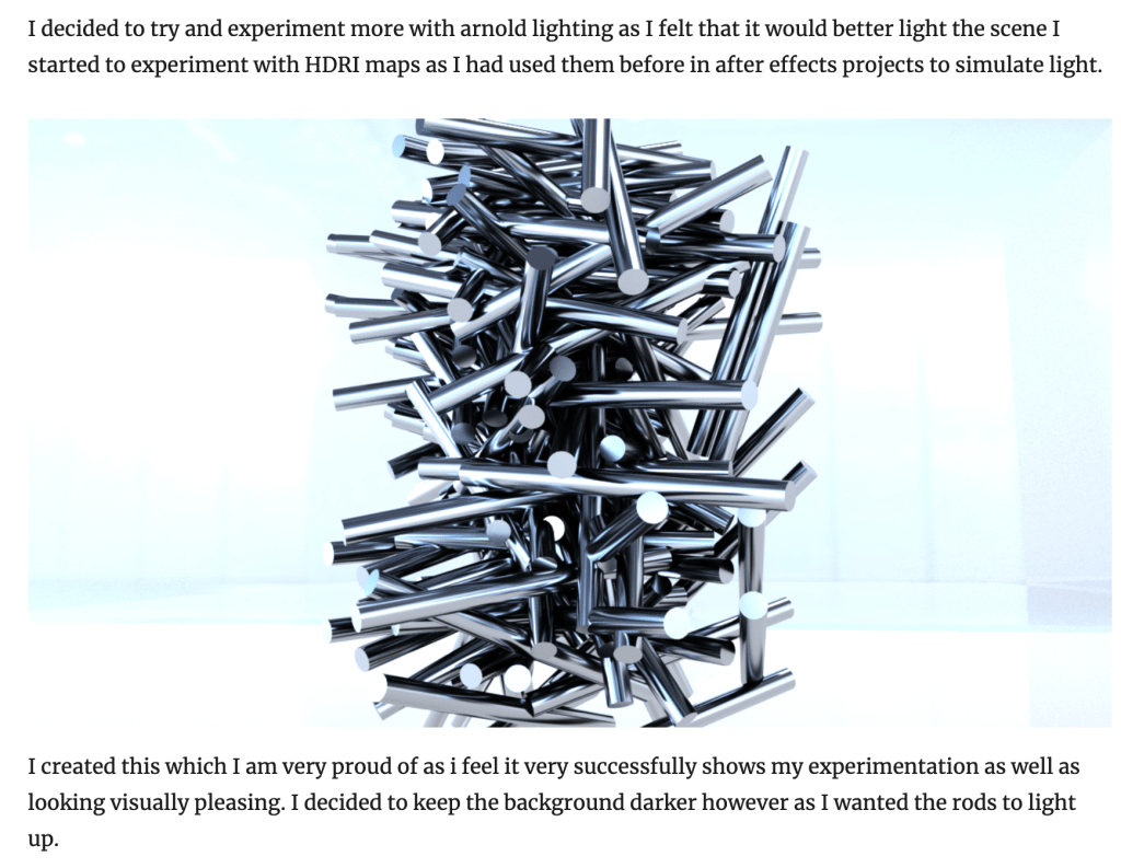 However this may still look good as it would be good to see it embedded in the site. I think however in terms of the documentation I feel like either the creative coding projects or the dimensions project. In terms of refining however I feel that my dimensions project is the one that would best fit as my original idea was very different to that of the final outcome.