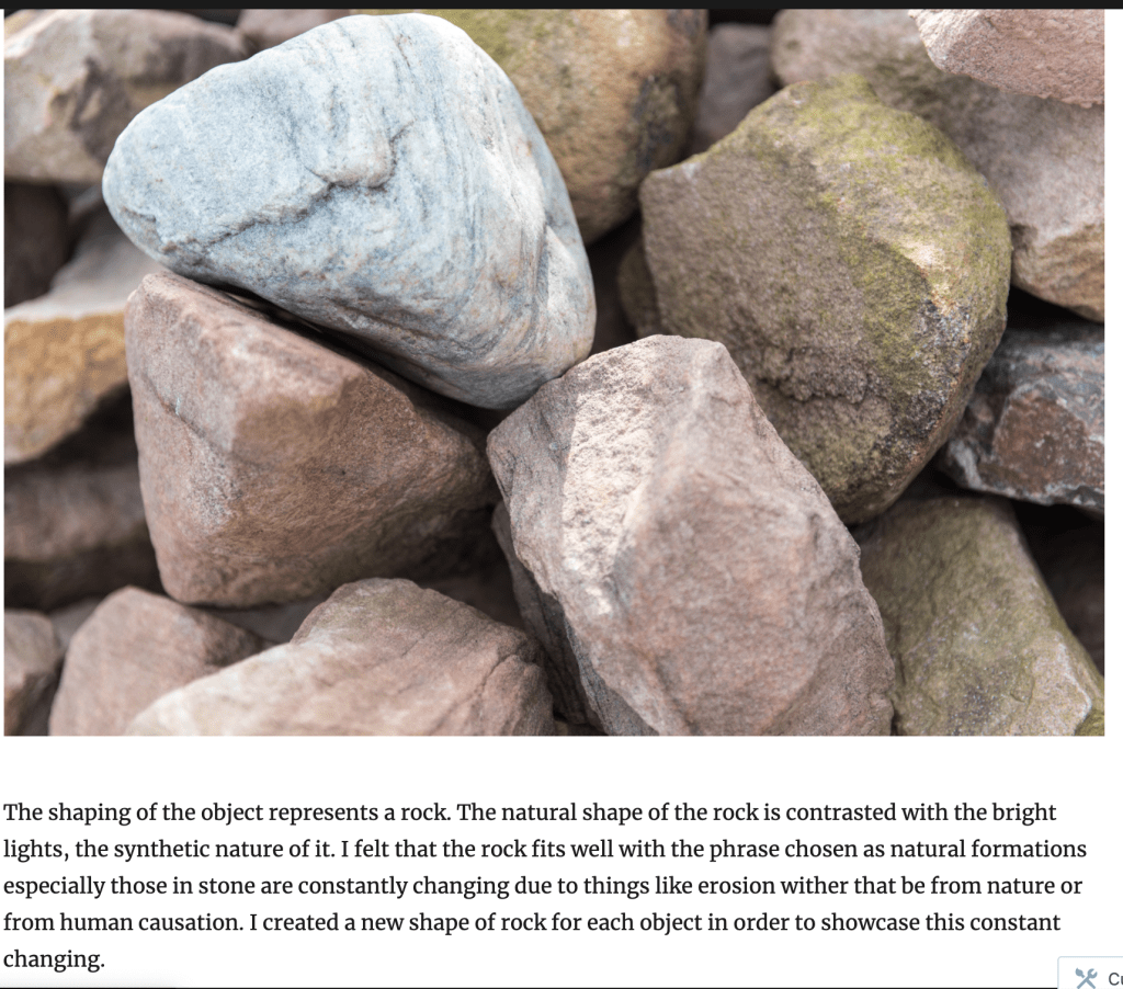 I feel like I can easily refine and document this project as it has probably one of the strongest concepts surrounding the phrase “never ending change” as well as with the idea of using rocks and nature as an example of this. I feel like spending some extra time on this will help me to further refine this.