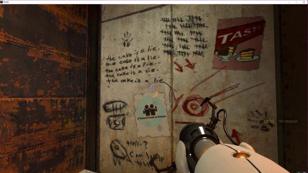 As the game goes on you find cracks in the walls and secret areas with scrawling on the walls, this is revealed to be from a scientist who survived the computer GLaDOS’ takeover of the facility, this again adds to the atmosphere of the game as not much of the story is directly told to the player it is hinted at and you need to find it.