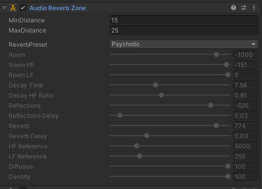 I also wanted to try reverb zones here as the player gets closer to the tower it kicks in applying the psychotic effect to the audio you hear this I feel adds a layer of tention, especially with the screaming and the heavy breathing sounds I have on the scene
