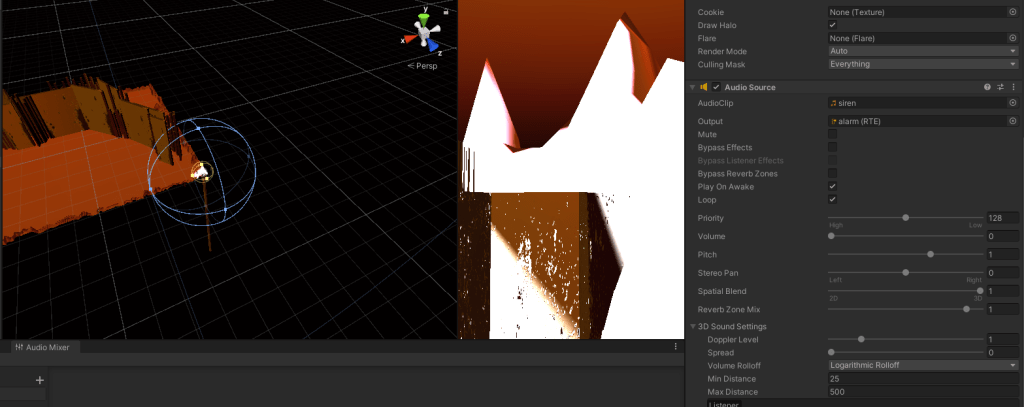 I also increased the minimum range of the siren so that it increases in volume as the player walks out of the maze, the light also turns white in an effort to signify that the final change of the scene has occurred, however I do wish to revisit this at a later stage in order to fully realise this part of the scene.