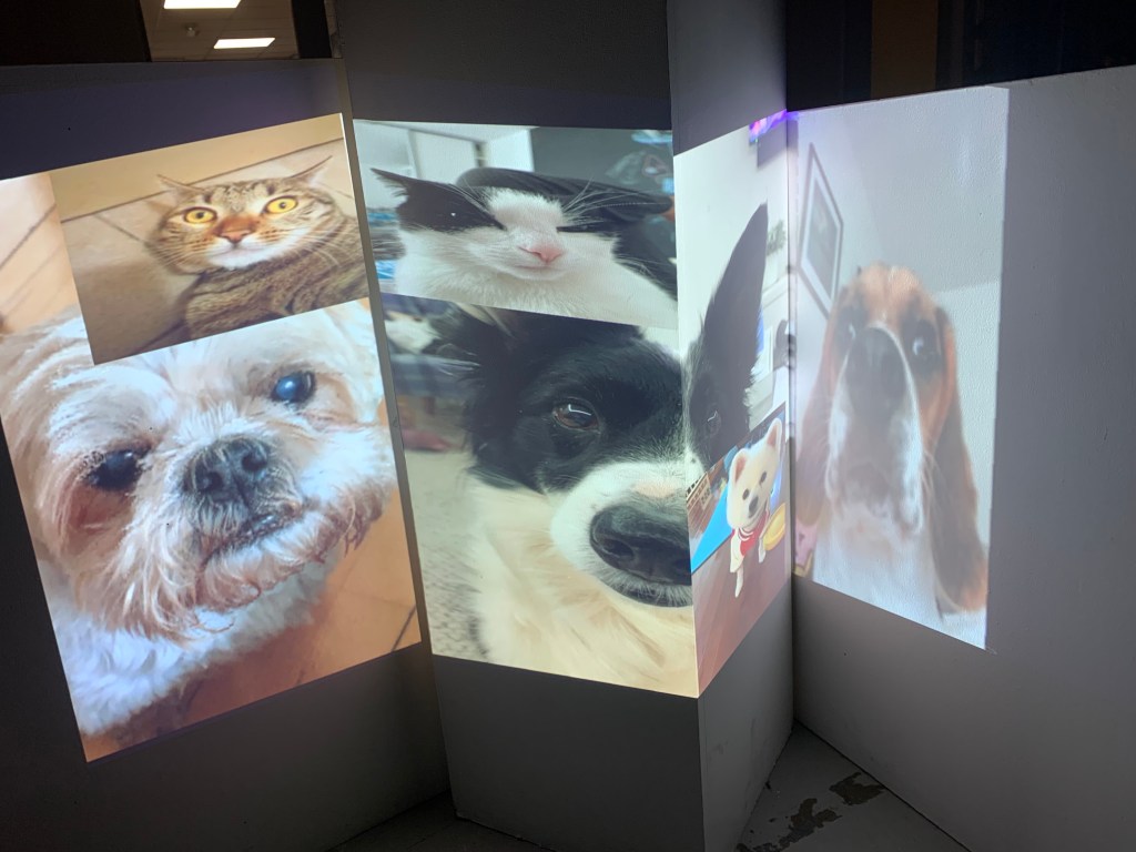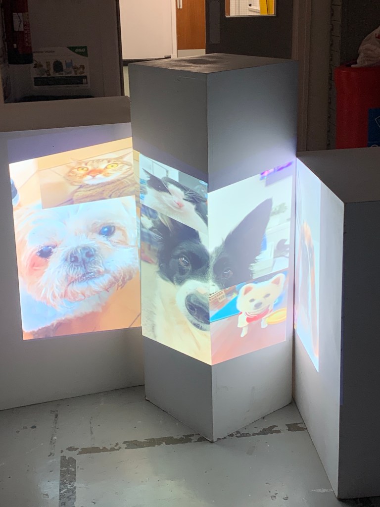 We broke off into groups and were at first a bit stuck at what to do, but eventually we all decided to map pictures of our pets to the plinths in the studio, keeping with the light touch theme of the project.
