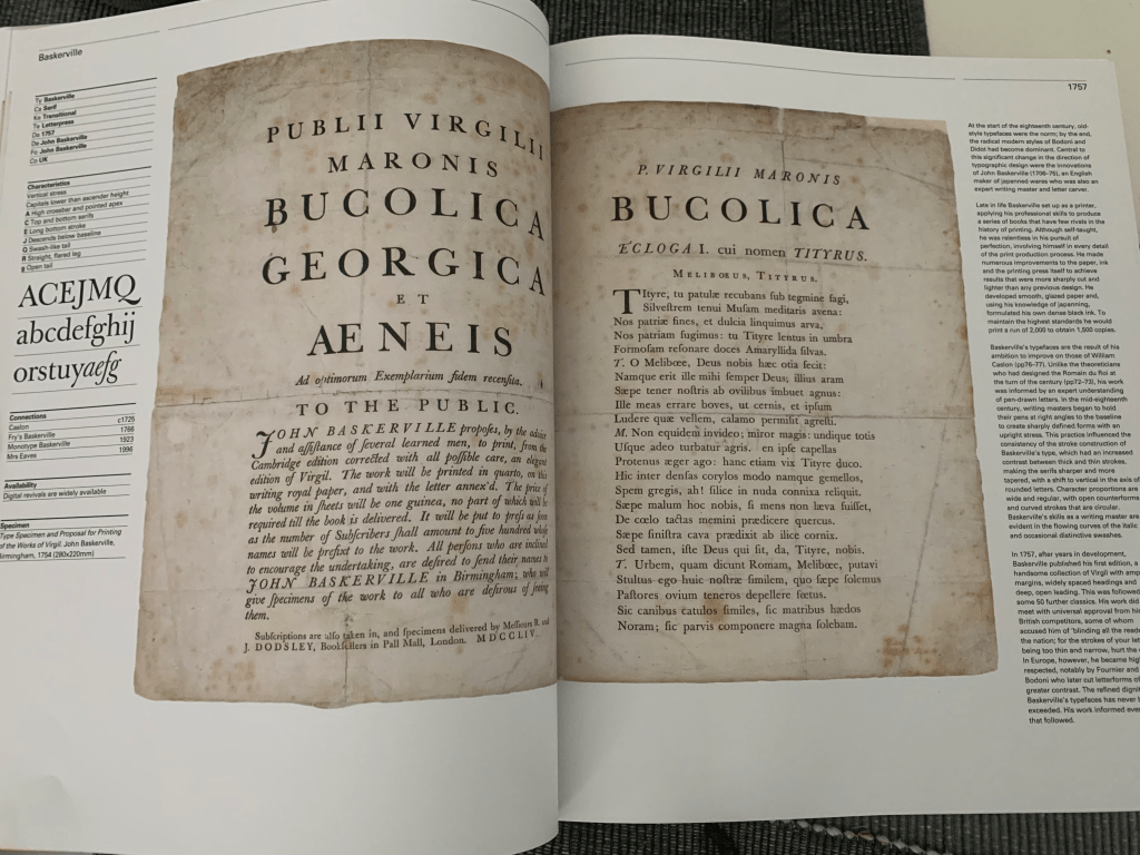 It is an insanely extensive book with various typefaces detailing how and why they were made which is really interesting to see the likes Baskerville that was made all the way back in 1757 still being used today in system fonts. Even detailing Ariel which to most is a boring font but it serves its purpose with the creators stating that it was intended to be a plain sans serif font interestingly being made for IBM not Microsoft.