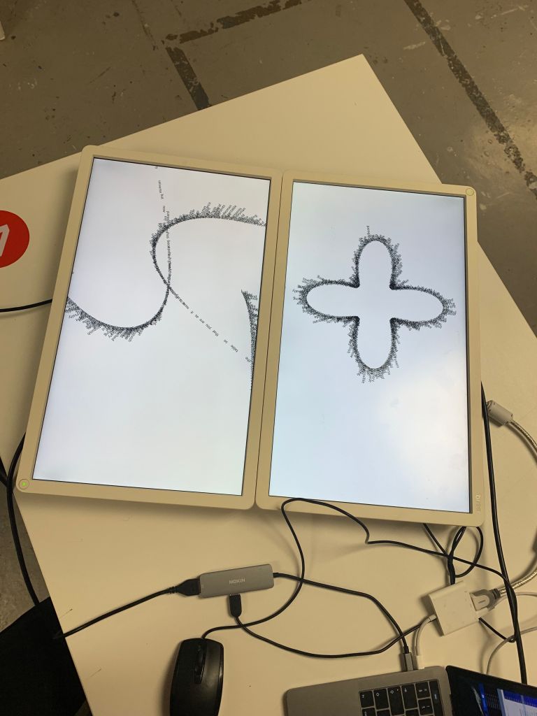 I then went on to experiment with a lot of trig values in this format, using frameCount and then the mouse to advance the sketch, however due to me using two monitors, there was some difficulties getting it to work as I wanted the two sketches to move in unison, which is allowed by frameCount, but not by the mouse.