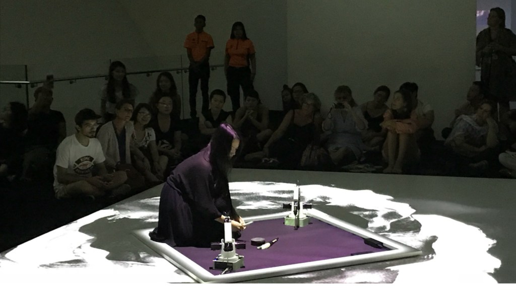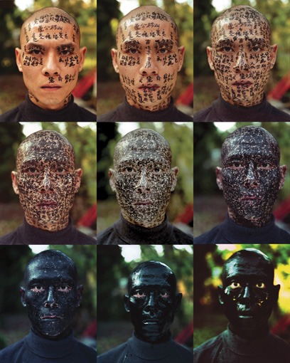 I also have been inspired by Zhang Huan’s family tree in which calligraphers paint names, places and stories over Zhang’s face, continuously obscuring his identity.